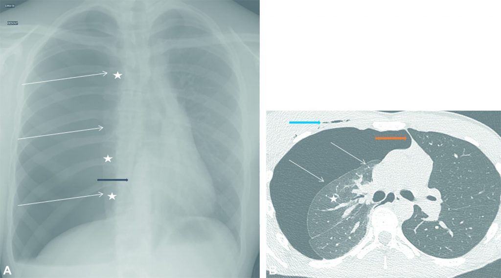 (A) Radiographie de thorax de face. Ligne bordante axillaire (flèches blanches) avec zone claire avasculaire et poumon rétracté vers le hile (étoiles blanches) se compliquant d’une déviation médiastinale vers la gauche (la flèche noire montre le bord droit du cœur décalé vers la gauche) en rapport avec un pneumothorax complet compressif sur le médiastin. (B) Scanner thoracique en fenêtre parenchymateuse en coupe axiale. La plèvre viscérale (flèche blanche) est visible avec un poumon rétracté (étoile blanche) et une déviation médiastinale vers la gauche (flèche orange). Il existe de l’air sous-cutané appelé emphysème sous-cutané (flèche bleue) en rapport avec une fracture costale (non visible ici).