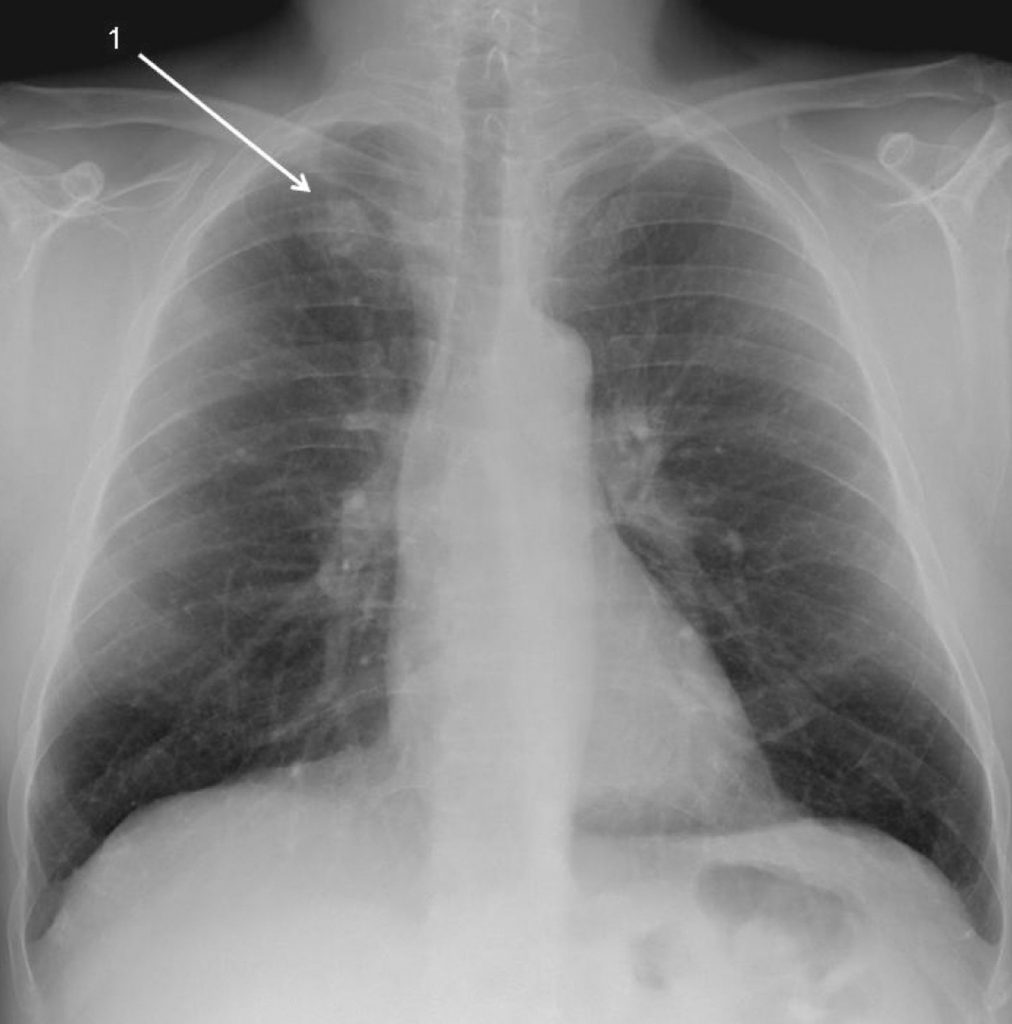 Fig. 101.1. Radiographie de face. Macronodule de l’apex pulmonaire droit (1).