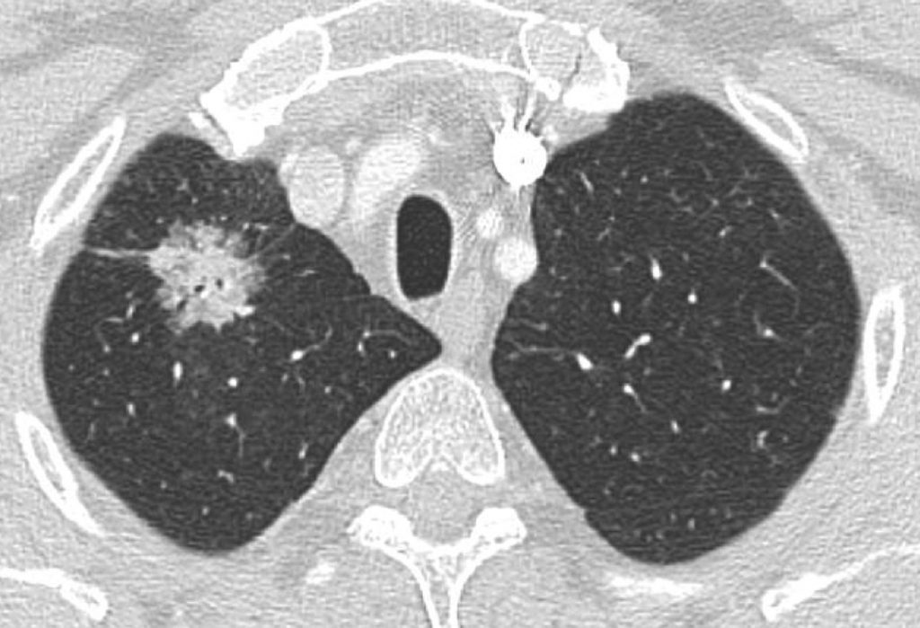 Macronodule du segment apical du lobe supérieur droit, de densité mixte (solide et « verre dépoli »), aux contours à la fois spiculés et lobulés. Après exérèse chirurgicale, l’examen anatomopathologique a révélé qu’il s’agissait d’un adénocarcinome bronchique.
