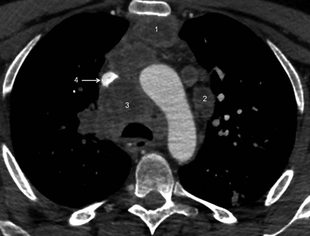 Multiples adénomégalies médiastinales partiellement nécrotiques intéressant la loge thymique (1), la chaîne para-aortique (2) et la chaîne paratrachéale droite, ou loge de Barety (3). Sur cette coupe, la veine cave supérieure (4) apparaît partiellement laminée par les adénopathies mais reste perméable. Il s’agissait d’un carcinome à petites cellules.
