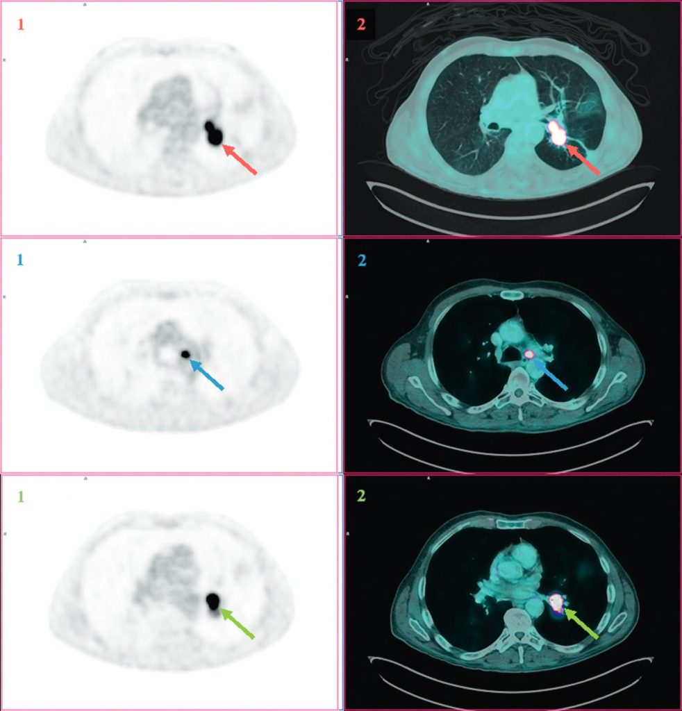 Hyperfixation pathologique en regard d’adénopathie hilaire homolatérale (flèche verte) et de la fenêtre aortopulmonaire (flèche bleue).