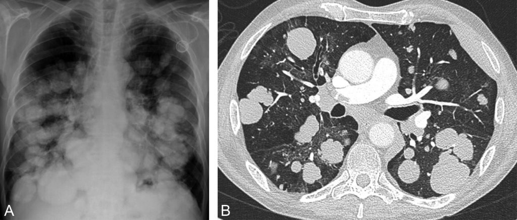 Multiples macronodules réalisant une image en « lâcher de ballons ». Il s’agissait de métastases d’un carcinome bronchique non à petites cellules indifférencié. À noter sur la coupe scanographique l’existence d’une embolie dans l’artère pulmonaire droite.