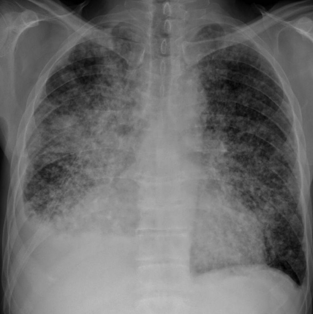 Syndrome micronodulaire bilatéral diffus associé à un épanchement pleural droit. Miliaire carcinomateuse sur néoplasie bronchique du lobe inférieur droit.