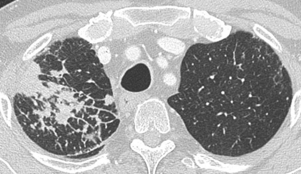 L’apex pulmonaire droit est le siège de lignes septales associées à des nodules de taille variable de topographie sous-pleurale et périlymphatique. Il s’agissait d’une lymphangite carcinomateuse compliquant un adénocarcinome bronchique multifocal du poumon droit.