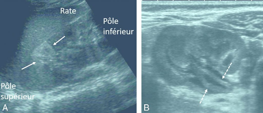Coupe longitudinale du rein gauche mettant en évidence une image triangulaire hyperéchogène du pôle supérieur du rein gauche (flèches) (A). Coupe axiale du rein gauche mettant en évidence un épaississement de la paroi du pelvis rénal (flèches en pointillé) (B).