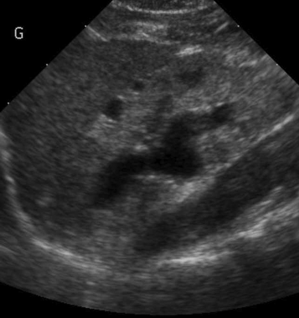 Coupe échographique longitudinale. Le rein est plus échogène que la rate ; disparition de la différenciation corticomédullaire normale, kystes périphériques et dilatation pyélocalicielle.