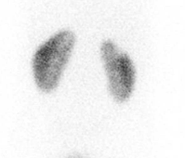Fig. 107.3  Scintigraphie au 99mTc-DMSA, vue postérieure : exemple de cicatrice corticale.