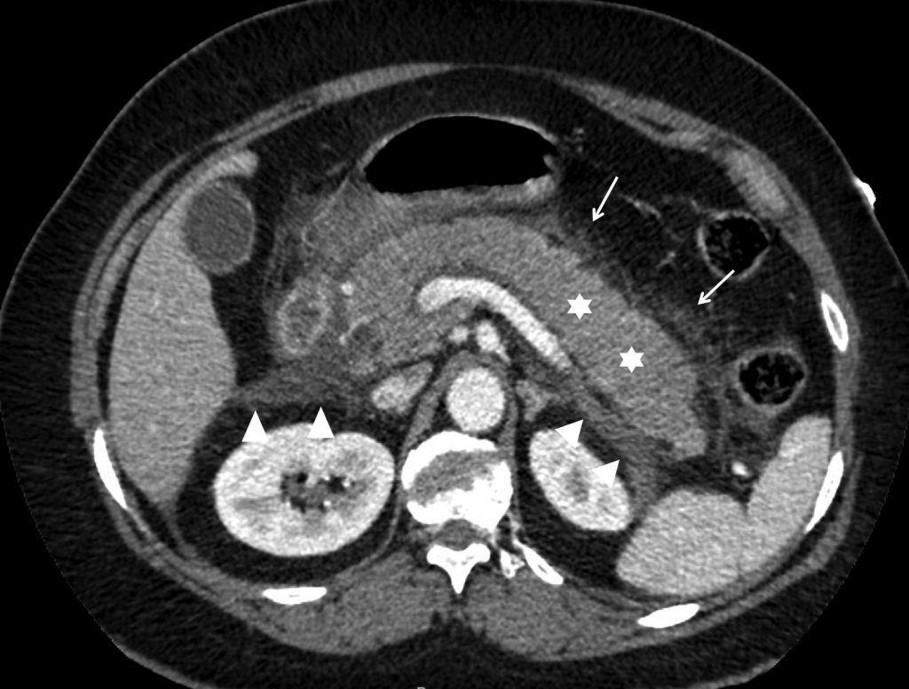 La biologie permet de diagnostiquer une pancréatite aiguë. Coupe scanner avec injection de produit de contraste iodé montrant un rehaussement normal et complet de la glande pancréatique (nécrose à 0 %, 0 point), un œdème de la glande pancréatique prédominant en région corporéo-caudale (étoiles blanches), une infiltration de la graisse péripancréatique (flèches blanches) et des collections aiguës liquidiennes le long des fascias pararénaux antérieurs (têtes de flèches) (4 points). Pancréatite aiguë interstitielle sévère (CTSI à 4).