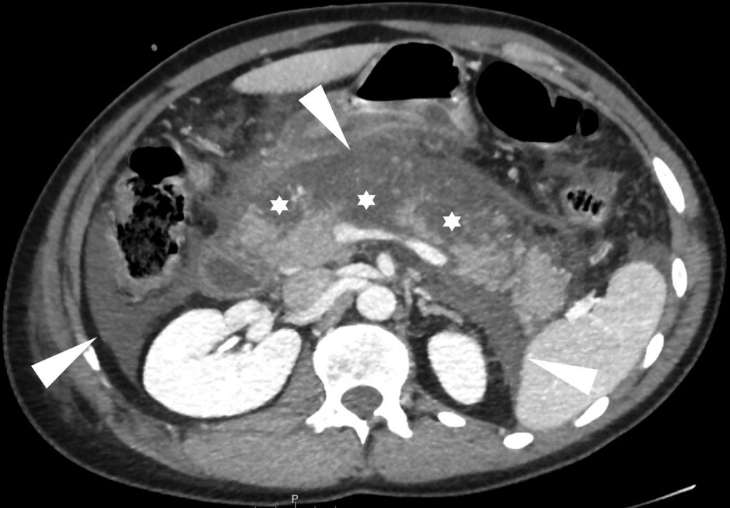 La biologie permet le diagnostic de pancréatite aiguë. Coupes scanner de l’abdomen avec injection de produit de contraste iodé. Défaut de rehaussement de la glande pancréatique touchant 30 à 50 % de la glande et atteignant l’isthme, le corps et la queue, (4 points) (étoiles) et multiples collections liquidiennes (têtes de flèche) (4 points). Pancréatite aiguë grave (CTSI à 8).