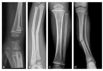 Fig. 115.1 Fracture en « motte de beurre » (A), en « bois vert » (B), en « cheveu » (C), en « bois vert » sur le tibia, incurvation traumatique plastique sur la fibula (D).