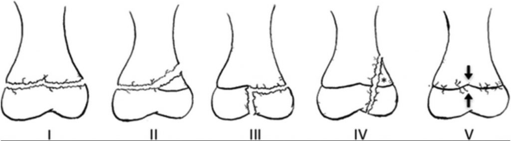 Fig. 115.2 Classification de Salter et Harris des fractures épiphysométaphysaires.