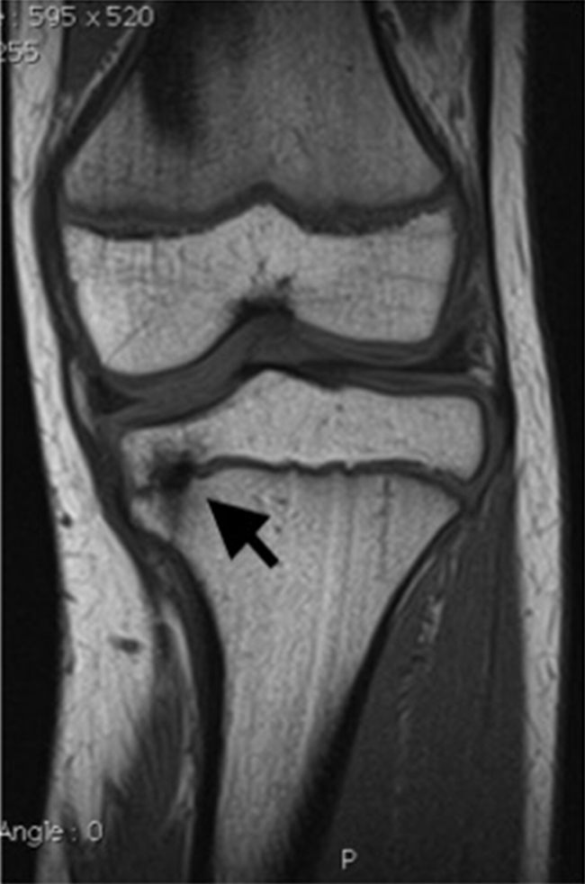 Fig. 115.3 IRM du genou gauche d’une enfant de 12 ans adressée pour varus du membre inférieur gauche. Séquence coronale T1. Varus tibial gauche lié à un pont d’épiphysiodèse proximal médial tibial (flèche) post-traumatique.
