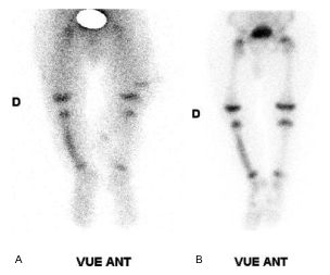 La radiographie du tibia était normale. Au temps précoce, 10 minutes après l’injection du radiopharmaceutique (A), on observe une hyperhémie de la jambe droite, et au temps osseux (B), une hyperfixation étendue du tibia droit. Cet aspect scintigraphique correspond à une fracture en « cheveu », dont le mécanisme habituel est une torsion osseuse sans atteinte du périoste.
