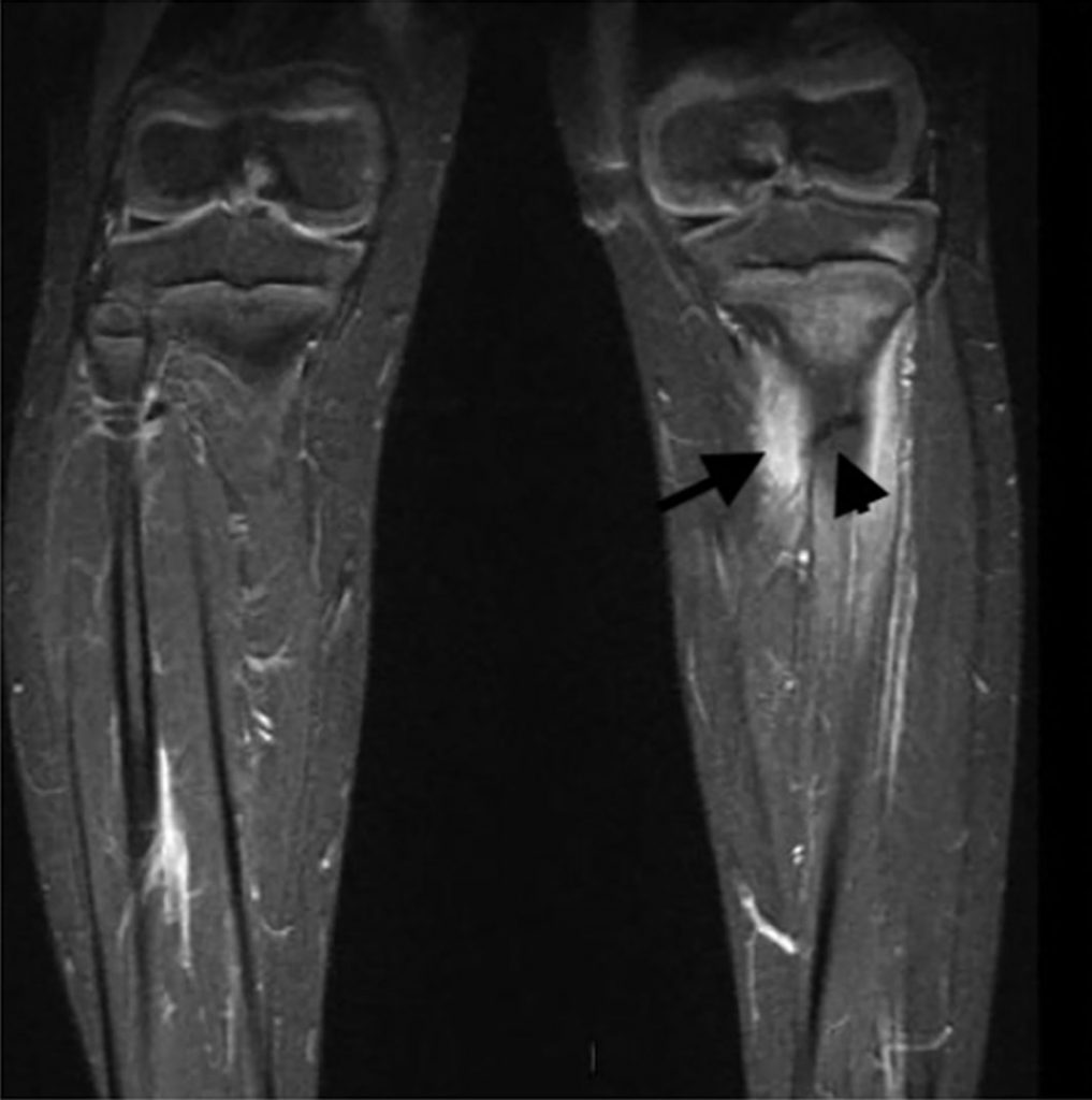 La radiographie de jambe était normale. L’IRM (coupe coronale STIR) sur les deux jambes montre le trait de fracture du tiers supérieur de la diaphyse tibiale gauche en net hyposignal (tête de flèche) associé à des appositions périostées en hypersignal (flèche).