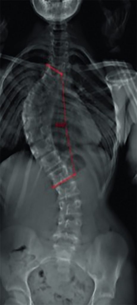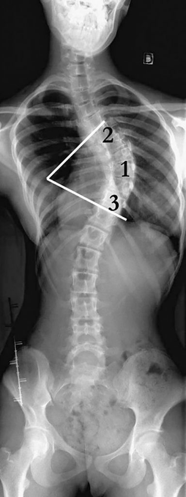 Scoliose thoracique idiopathique à convexité droite dont les vertèbres sommet sont les vertèbres T4 et L1. L’angle de Cobb, ici mesuré en 2D, quantifie la scoliose.