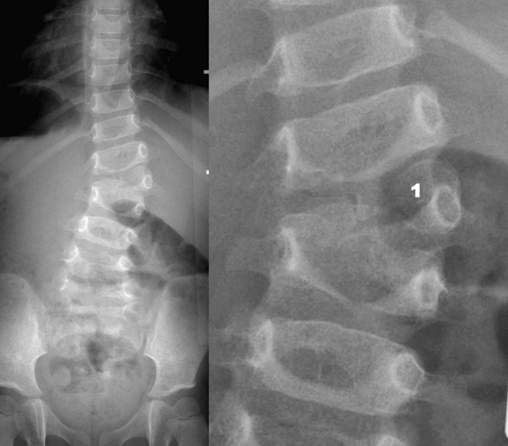 Il existe une courbure rachidienne lombaire à convexité droite en rapport avec une hémivertèbre droite surnuméraire (1) entre L1 et L2.