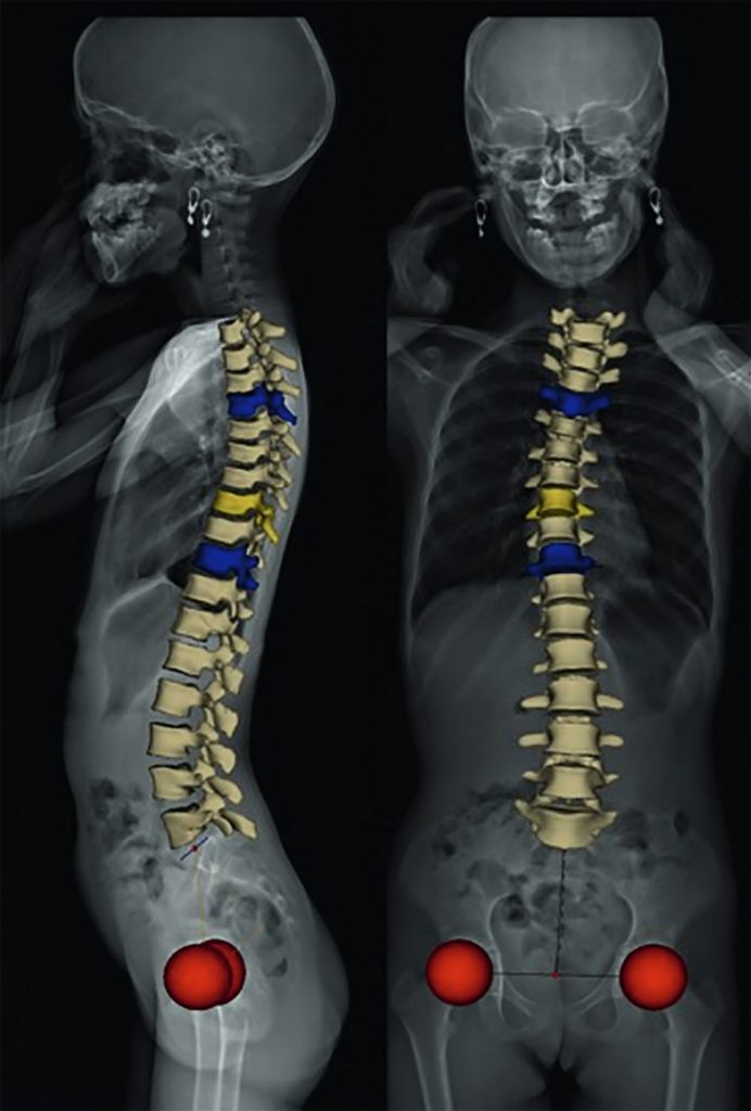 Les vertèbres limites sont en bleu, la vertèbre sommet en jaune et les têtes fémorales en rouge. Ceci permet une mensuration 3D de l’angle de Cobb plus proche de la réalité, la scoliose étant une déformation tridimensionnelle.