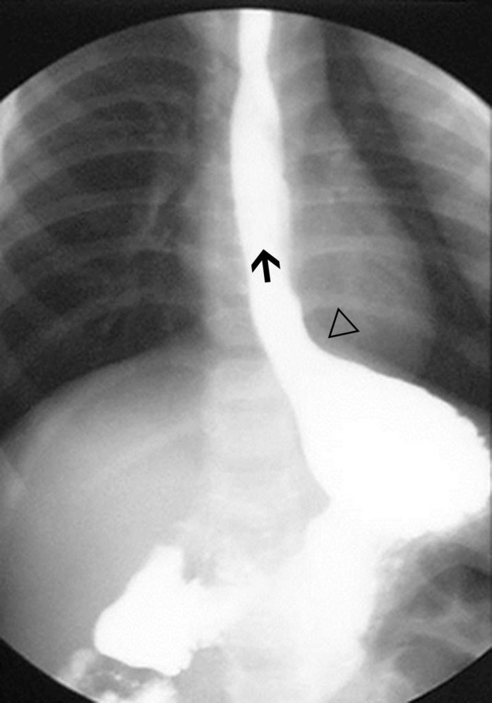 Reflux massif du produit de contraste baryté mis en place dans l’estomac par une sonde nasogastrique retirée après le remplissage. Le cardia (flèche) est béant. L’incisure du cardia (angle de His) (tête de flèche) est très ouverte.
