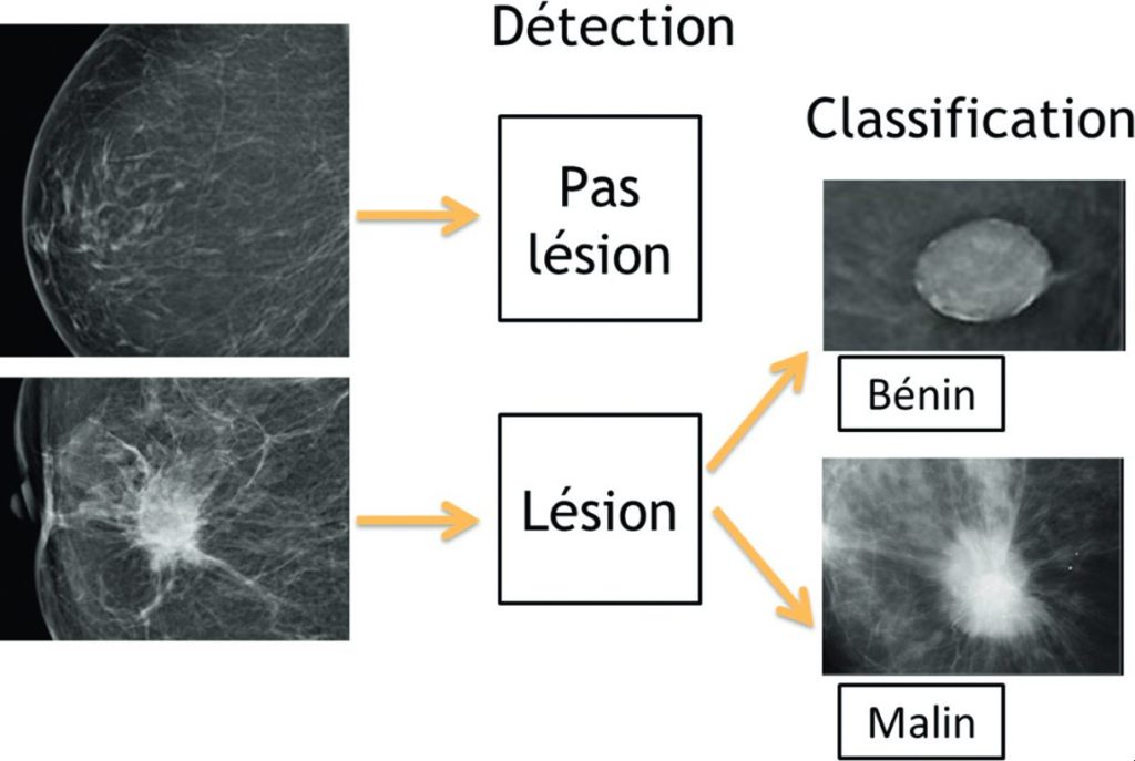Les algorithmes de détection permettront d’identifier s’il existe une lésion ou non. Les algorithmes de classification permettront d’estimer le risque qu’il s’agisse d’une lésion bénigne ou maligne.