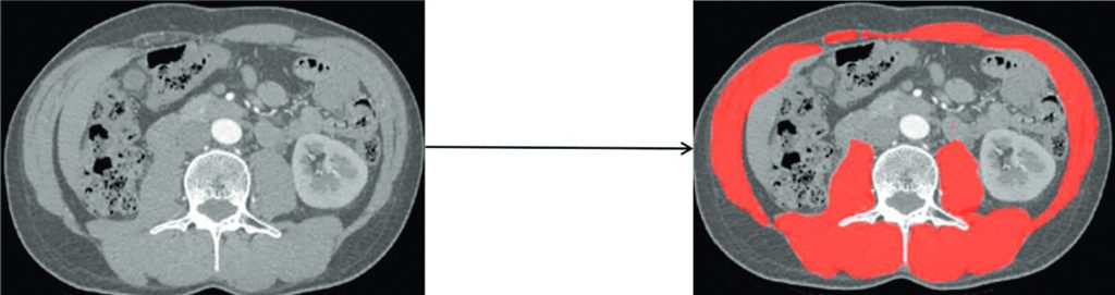 À gauche, une coupe axiale de scanner après injection chez un patient porteur d’un cancer, à hauteur de la vertèbre L3. Un algorithme fondé sur un réseau de neurones permet de délimiter (segmenter) les muscles de la paroi abdominale sur toute la circonférence : en avant et latéralement, les muscles grands droits, petits et grands obliques et transverses ; en arrière, les muscles psoas, carrés des lombes, épineux, longissimus du thorax et iliocostaux lombaires. La surface de ces muscles est rapportée à la taille au carré, définissant le Skeletal Muscle Index (SMI), dont la valeur, quand elle est basse, définit la sarcopénie.