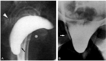 L’urétrocystographie rétrograde et mictionnelle pourra être réalisée à la recherche d’une sténose de l’urètre (rétrécissement plus ou moins long d’un segment de l’urètre et distension d’amont en permictionnel).