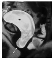 Cystocèle avec importante bascule postérieure de la base de la vessie (∗) et descente du moignon vaginal entraîné par la cystocèle (flèche).