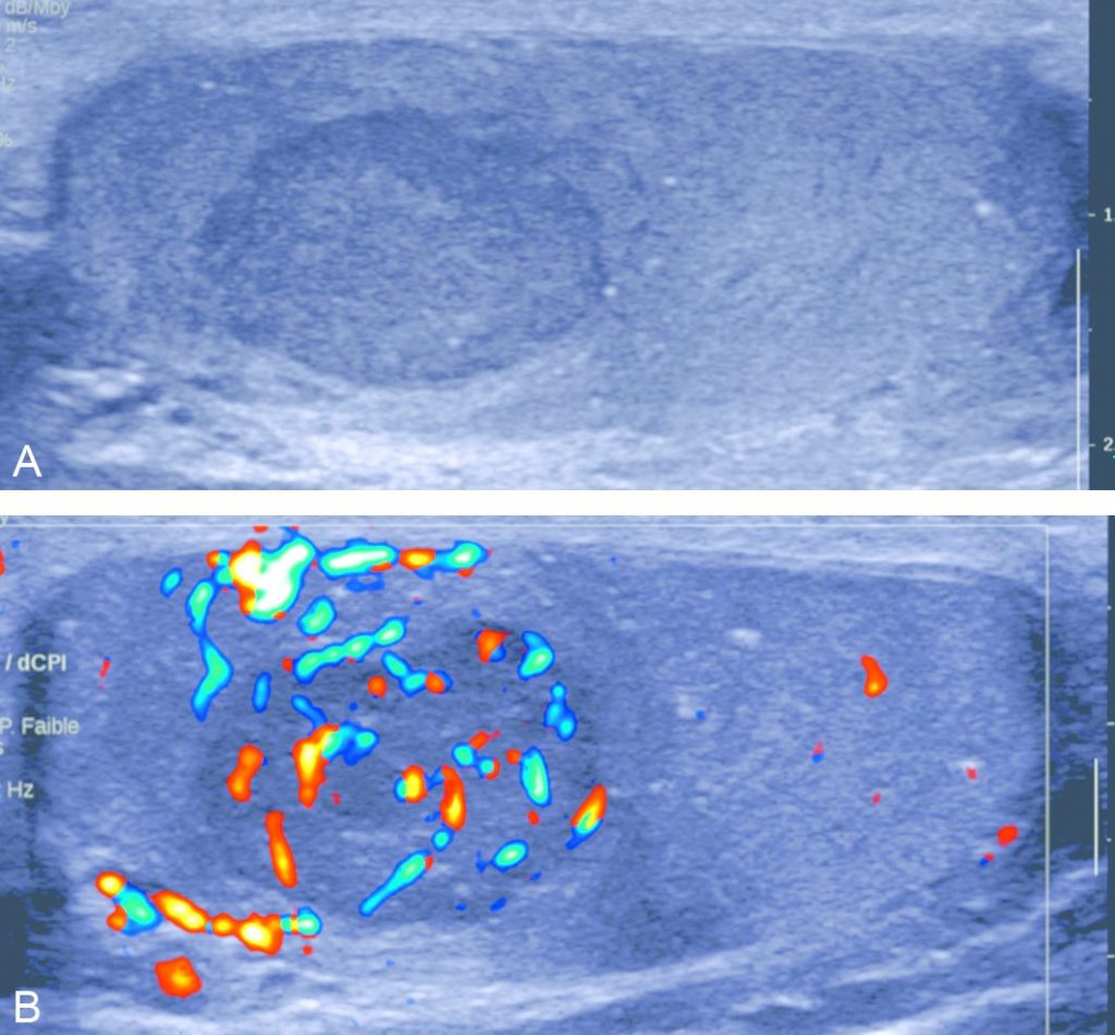 En mode B (A), masse nodulaire hypoéchogène intratesticulaire (flèche), quelques calcifications (microlithes) dans le parenchyme. Mode doppler couleur (B) montrant la vascularisation du nodule.
