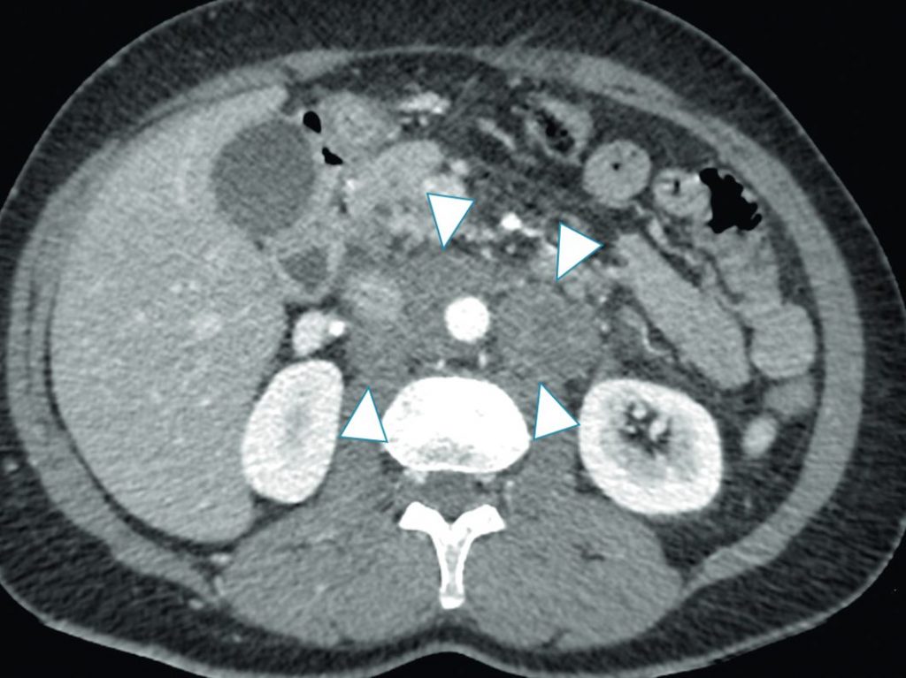 Fig. 32.2 TDM après injection de produit de contraste iodé : multiples adénopathies rétropéritonéales (têtes de flèches).