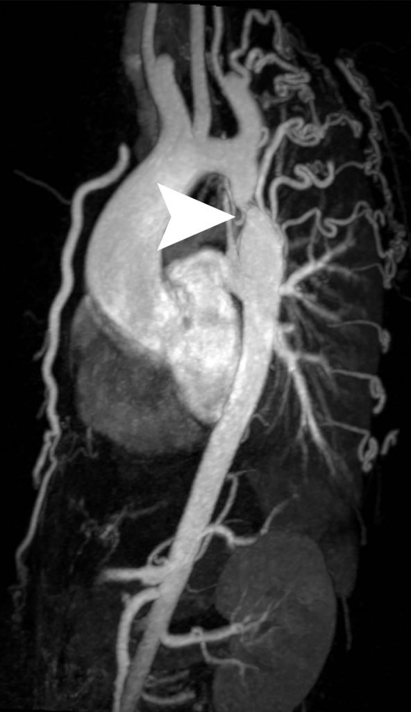 Coarctation de l’aorte : sténose aortique courte en regard de l’isthme (tête de flèche), avec dilatation post-sténotique et de nombreuses artères collatérales hypertrophiées (notamment les artères intercostales).