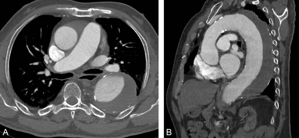 Il se traduit sur la coupe axiale (A) par une augmentation du diamètre de l’aorte descendante qui dépasse celui de l’aorte ascendante. La reconstruction sagittale oblique montre que cet anévrisme est développé dans la concavité aortique au niveau de l’isthme, après l’origine de l’artère subclavière gauche (B).