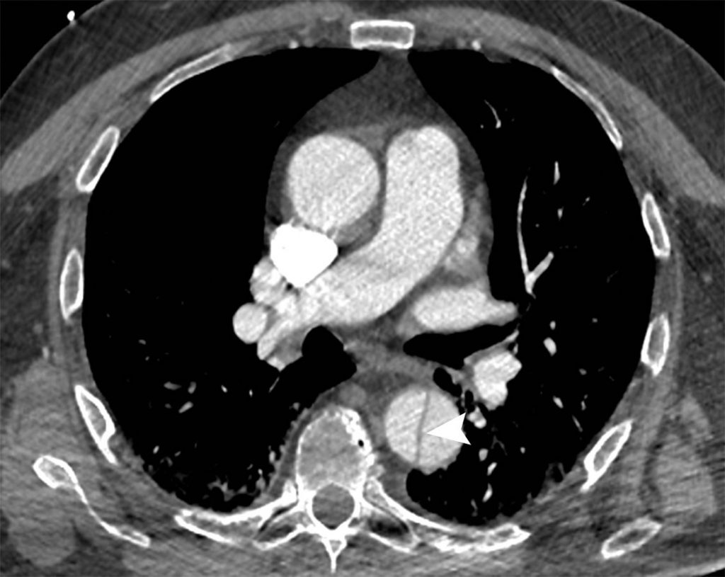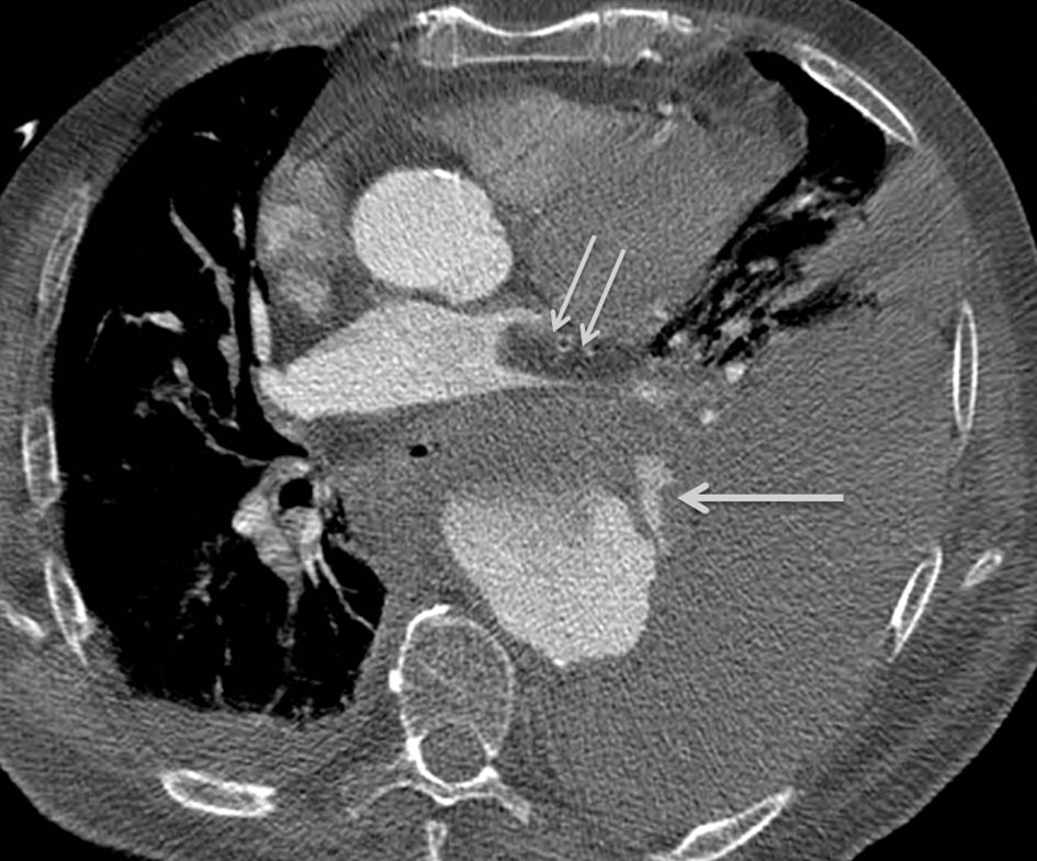 Celle-ci se traduit par la présence d’un hémomédiastin autour de l’aorte, d’un volumineux hémothorax gauche. La zone de fissuration est bien visible (flèche). À noter la présence concomitante d’une embolie pulmonaire dans l’artère pulmonaire gauche (double flèche).