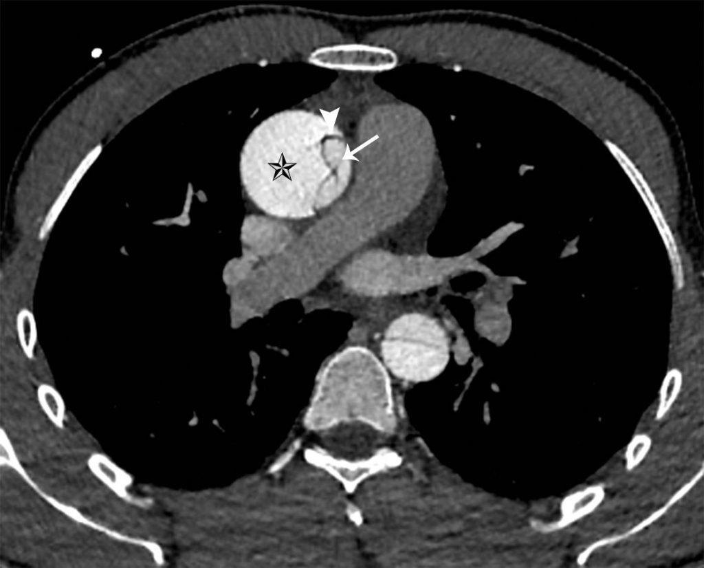 Fig. 36.7. Angioscanner thoracique en coupe axiale d’un anévrisme de l’aorte ascendante associée à une dissection de type A avec un flap intimal (tête de flèche) dans l’aorte ascendante et dans l’aorte descendante, séparant le vrai (flèche) et le faux chenal (étoile).