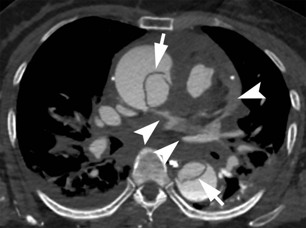 Fig. 36.9. Flap intimal de l’aorte ascendante et de l’aorte thoracique descendante (flèches) en rapport avec une dissection aortique de type A compliquée d’une rupture péricardique (têtes de flèche) et d’un hémopéricarde.