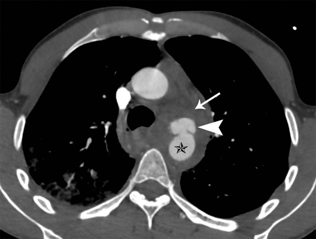Fig. 36.12. Angioscanner thoracique montrant la lumière aortique de l’isthme (étoile) déformée à cause de la dissection localisée avec développement d’un faux anévrisme (tête de flèche) et d’un hémomédiastin (flèche).