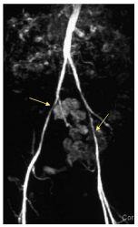 Fig. 38.1 Exemple de sténose bilatérale de l’artère iliaque externe en angio-IRM des membres inférieurs.