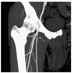 Fig. 38.3 Exemple d’angioscanner des membres inférieurs montrant un rétrécissement localisé de l’artère fémorale immédiatement en aval de la naissance de l’artère profonde de la cuisse avec une hypertrophie compensatrice de cette dernière.