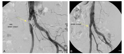 L’artériographie en premier temps de l’angioplastie montre la lésion (A) et l’artériographie après la poste du stent montre le rétablissement du diamètre artériel (B).
