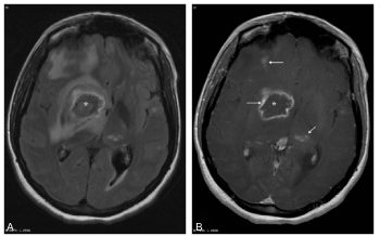 Coupe axiale pondérée en T2/FLAIR (A) et en T1 après injection (B) : présence de plusieurs lésions en hypersignal en T2, prenant le contraste (flèches) et entourées d’un œdème. La plus volumineuse (∗) touche les noyaux gris. Ces lésions correspondent à des abcès intracérébraux à toxoplasme.