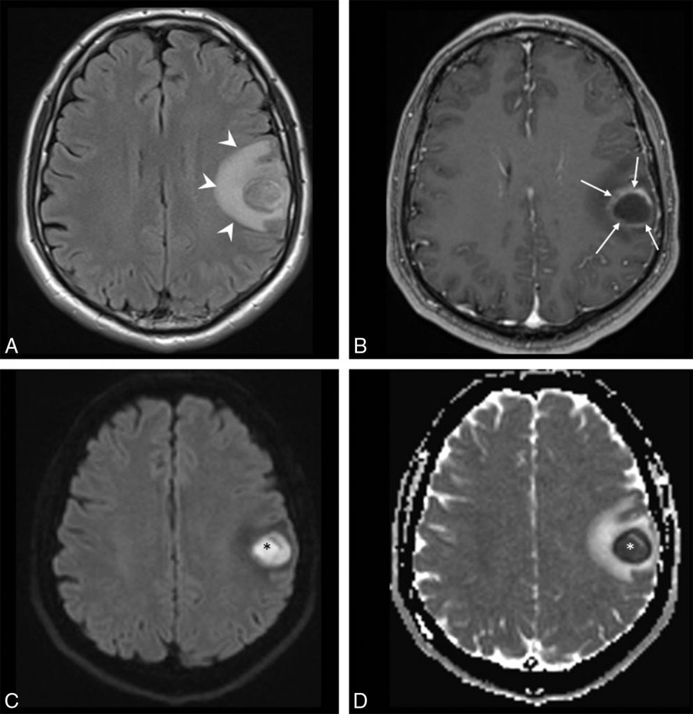 Coupes axiales en FLAIR (A), en T1 avec injection de gadolinium (B), en diffusion (C) avec cartographie du coefficient apparent de diffusion (ADC) (D). Collection intracérébrale frontale gauche en hyposignal en T1 limitée par une paroi prenant fortement le contraste (flèches), œdème périlésionnel étendu de la substance blanche en hyposignal en T1 et en hypersignal en FLAIR (têtes de flèches). Hypersignal en diffusion avec ADC diminué caractéristique d’un abcès à pyogènes (∗).