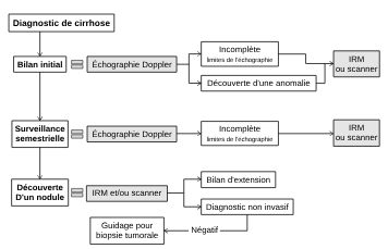 Le suivi de la cirrhose repose sur la réalisation d’une échographie abdominale tous les 6 mois. Ce suivi a principalement pour but de détecter précocement la survenue d’un carcinome hépatocellulaire à une taille permettant encore un traitement à intention curative.