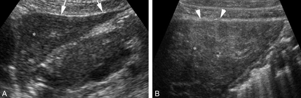 Le foie sain présente un parenchyme d’aspect homogène (∗) et des contours lisses (flèches). Le foie cirrhotique est d’échostructure grossière et hétérogène (∗). La surface du foie est bosselée (têtes de flèches).