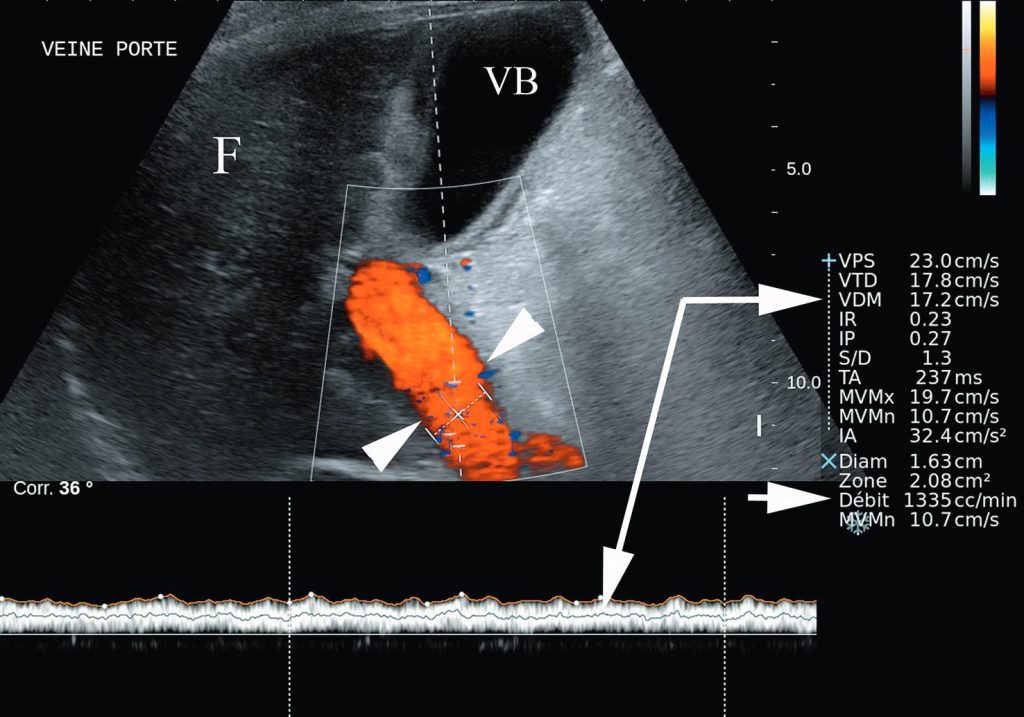 La veine porte (têtes de flèche) présente un flux se dirigeant vers la sonde (codé en rouge orangé au doppler couleur) donc se dirigeant normalement vers le foie (F). On dit qu’il est hépatopète. Le doppler pulsé renseigne sur la vitesse du flux porte (ici 17 cm/s) (flèches longues). Après mesure du diamètre de la veine porte, l’échographe calcule la vitesse du flux sanguin portal (après correction de l’angle de tir) (flèche courte). En cas d’hypertension portale, la vitesse diminue, le flux porte peut même s’inverser et devenir hépatofuge. Des veines de dérivation peuvent être visibles en doppler couleur, mais elles sont plus facilement détectées au scanner.