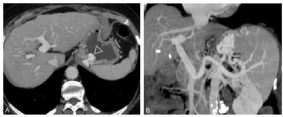 - l’hypertension portale, avec l’apparition de voies de dérivation (shunts) entre le réseau porte et le réseau veineux systémique, dont le but est de contourner le foie. Certaines de ces voies de dérivation sont visibles en endoscopie digestive haute mais aussi et surtout en imagerie ; certaines voies de dérivation forment des varices qui sont à risque de saignement (hémorragie digestive) ;