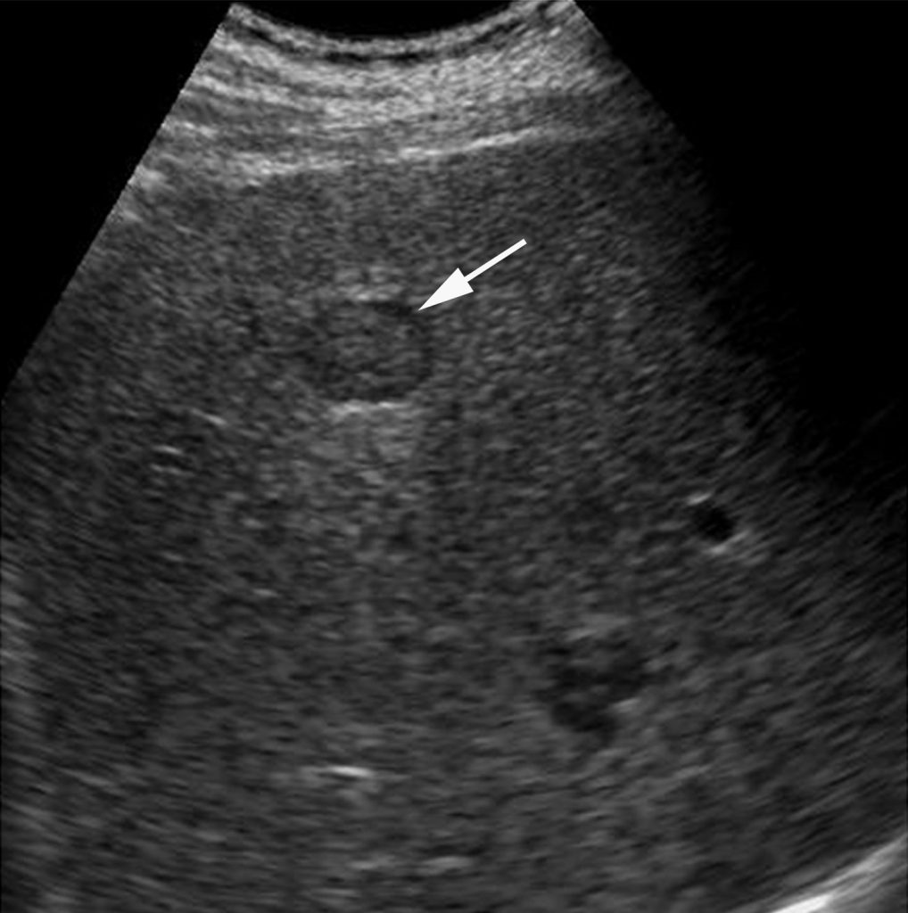 Fig. 5.5 Identification d’un nodule (flèche) lors d’une échographie de surveillance d’un foie de cirrhose.