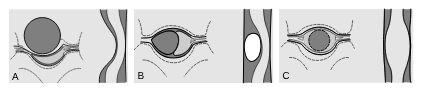 Compression de type extradural (A) : la lésion du corps vertébral refoule la dure-mère. Les espaces sous-arachnoïdiens sont « rétrécis » par la lésion. Compression de type intradural extramédullaire (B) : la lésion est située dans les espaces sous-arachnoïdiens ; elle déplace le cordon médullaire et « élargit » les espaces sous-arachnoïdiens. Compression de type intramédullaire (C) : la lésion est située dans la moelle spinale ; elle élargit celle-ci sur toutes les coupes ; les espaces sous-arachnoïdiens sont « rétrécis ».