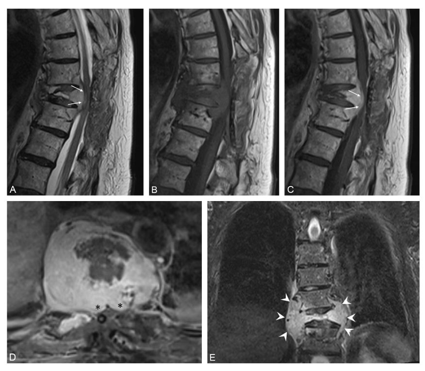 IRM en coupes sagittales pondérées en T2 (A), en T1 sans (B) et après injection de gadolinium (C), et axiales (D) et frontales (E) pondérées en T1 après injection de gadolinium avec saturation des graisses. Tassement vertébral avec recul du mur postérieur (flèches) et compression médullaire de type extradural. Rehaussement après injection du tissu tumoral avec extension épidurale antérieure (∗) et paravertébrale (têtes de flèche) bilatérale, bien visible respectivement en coupes axiale et frontale.
