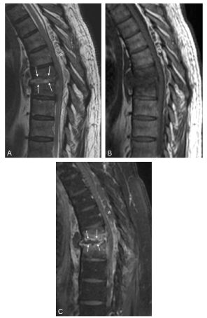 IRM en coupes sagittales pondérées en T2 (A) et en T1, sans (B) et avec injection de gadolinium et saturation des graisses (C). Atteinte centrée sur le disque T7-T8 (flèches) qui apparaît en hypersignal en T2 et qui prend le contraste en périphérie. Cette atteinte s’étend aux corps vertébraux adjacents dont les plateaux sont irréguliers et aux espaces pré- et paravertébraux. Il existe également une coulée infectieuse épidurale postérieure (∗).