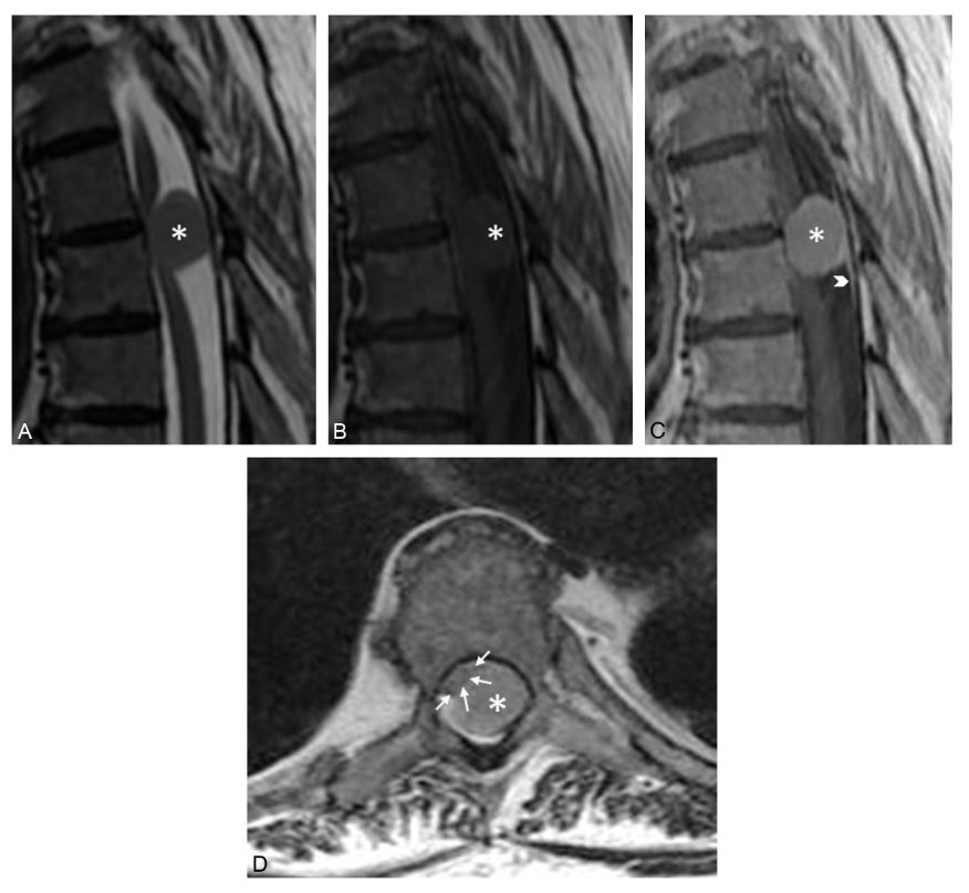 IRM en coupes sagittales pondérées en T2 (A) et en T1, sans (B) et avec injection de gadolinium (C), et coupe axiale pondérée en T1 après injection (D). Masse à contours bien limités (∗) en isosignal en T2, en hyposignal en T1, prenant le contraste de façon intense et homogène et refoulant le cordon médullaire vers l’avant et vers la droite (flèches). Noter le raccordement méningé avec épaississement de la dure-mère, en « queue de comète » (tête de flèche).