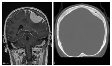 Coupe frontale IRM pondérée en T1 avec injection de gadolinium (A) : masse pariétale gauche extraparenchymateuse (c’est-à-dire refoulant le cortex cérébral), prenant fortement le contraste, et associée à un épaississement méningé (flèches) avec hyperostose de la voûte crânienne au contact de la lésion (∗) sur le scanner en fenêtre osseuse (B).