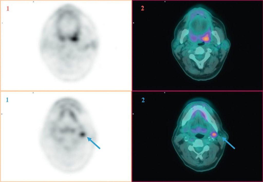 Fig. 63.1 Images TEP au 18FDG (1) et TEP au 18FDG fusionnée à la TDM (2) en coupes axiales montrant une asymétrie de fixation en regard de l’oropharynx dans un contexte d’adénopathie métastatique sous-digastrique gauche sans porte d’entrée (flèche bleue) ayant permis de révéler un carcinome épidermoïde de l’amygdale gauche après biopsie ciblée.